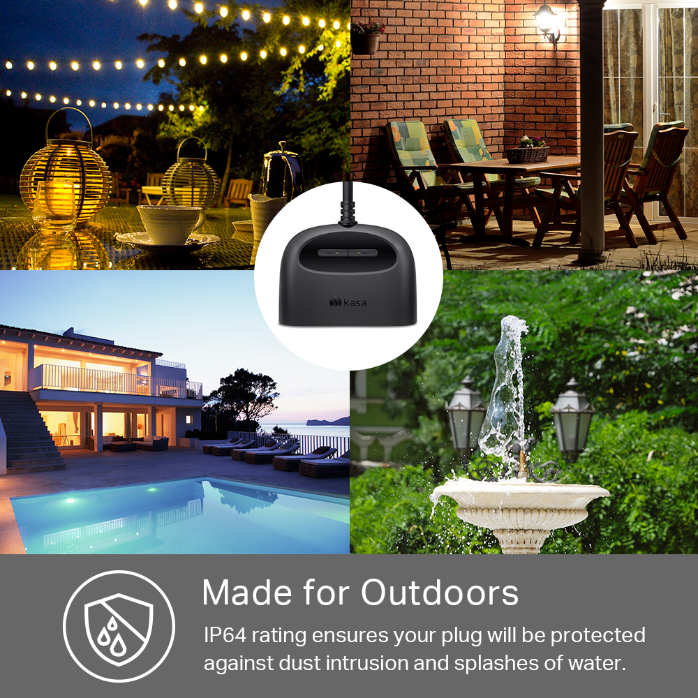 The Kasa Smart Wi-Fi Outdoor Plug has an IP64 rating that ensures your device is protected from dust and splashes of water from any direction. When not in use, the sockets should remain capped with the included weather-resistant cover.
